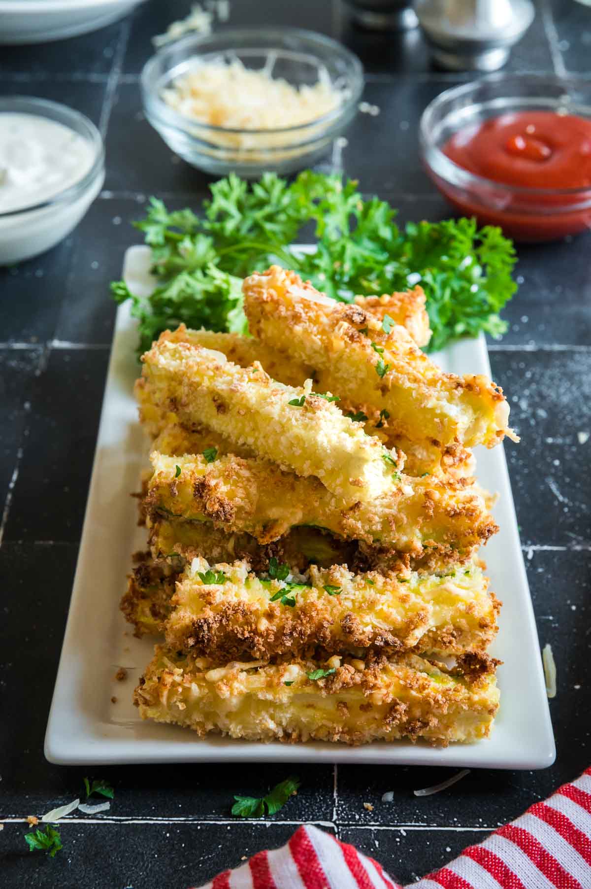 Have a tray of air fryer zucchini fries ready after school for the kids. Have a few dips ready on the side like ketchup, ranch, or garlic aioli! They’ll love the crunchy coating and the parmesan seasoning and dunking before every bite. They might not even remember they’re eating a zucchini!
