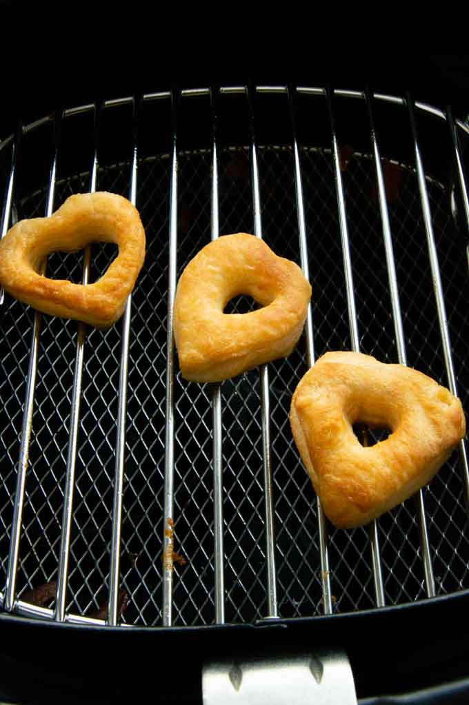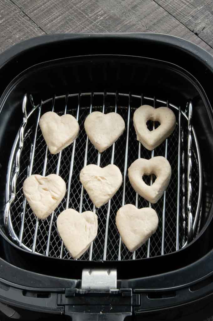 Heart shaped Airfryer donuts come together in less than 10 minutes and are perfect for Valentine's Day! Made with store-bought biscuit dough so no mixing at all! #valentinesday #heartshaped #donuts #valentinesdayfood #valentinesdayideas