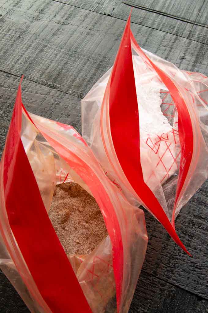 - While the donuts are baking, place powdered sugar in one zip lock bag and the cinnamon and sugar in the other. Once you remove the donuts from the Airfryer, immediately toss them in the coating of your choice. (We usually do more of the powdered sugar because we like those better!)