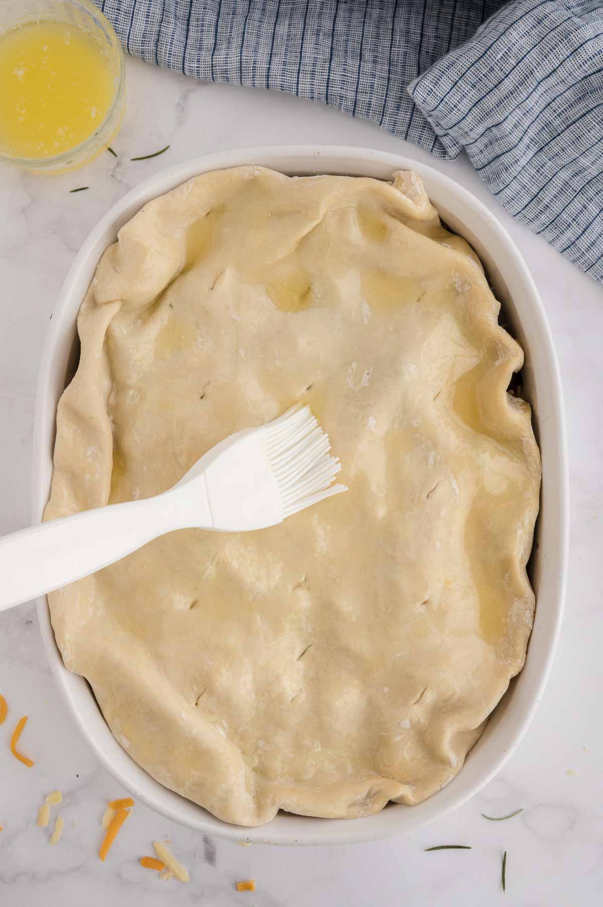- Roll out the puff pastry. Carefully lift the pastry and place it over the top of your baking vessel. Carefully tuck the edges inside the dish. Brush the top with melted butter and bake in the oven for 10-12 minutes until the pastry has puffed and is golden brown.