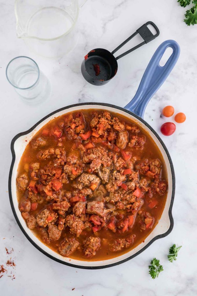 - Heat the olive oil in a large skillet set over medium heat; cook sausage, onion, red pepper and garlic for about 5 minutes or until sausage starts to brown and vegetables are slightly softened.