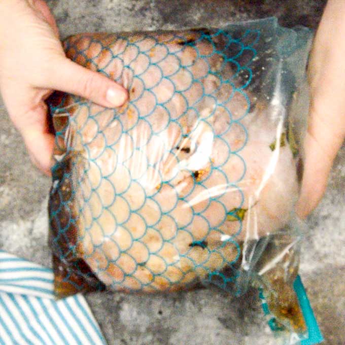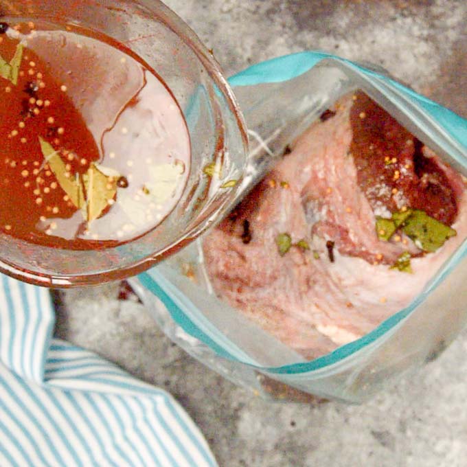 - Pour the chilled brine over the top, remove any air and seal the bag. Be sure to submerge the beef fully. (I actually use 2 oven bags so in case any leaks. — these from Amazon work great (they would be at your grocery store too— but so you know what to look for!)
