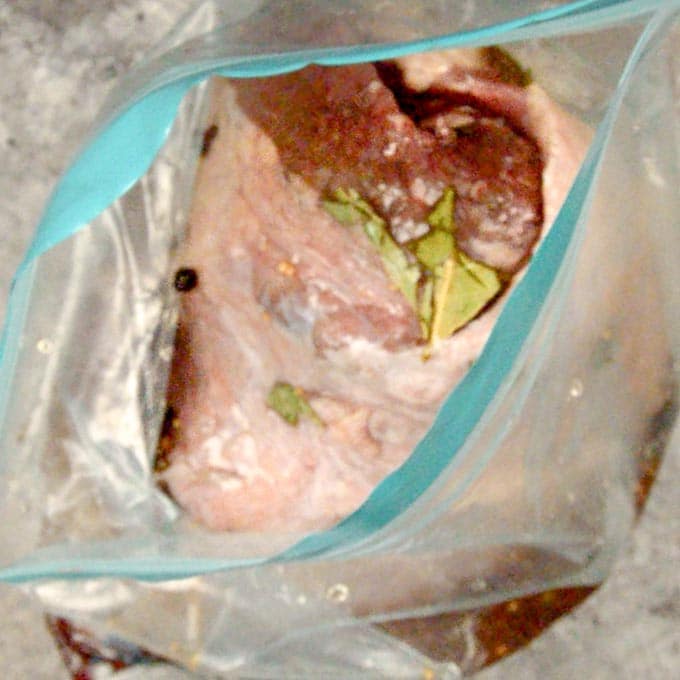 - Pour the chilled brine over the top, remove any air and seal the bag. Be sure to submerge the beef fully. (I actually use 2 oven bags so in case any leaks. — these from Amazon work great (they would be at your grocery store too— but so you know what to look for!)