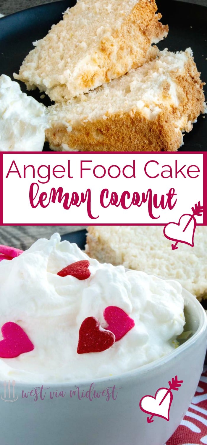 Lemon Coconut Angel Food Cake is so light, airy and slightly sticky. A perfect bite to go along with fresh fruit, whipped cream or by itself.