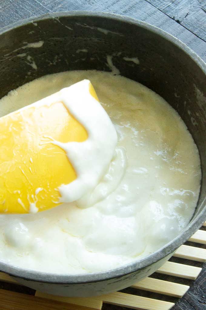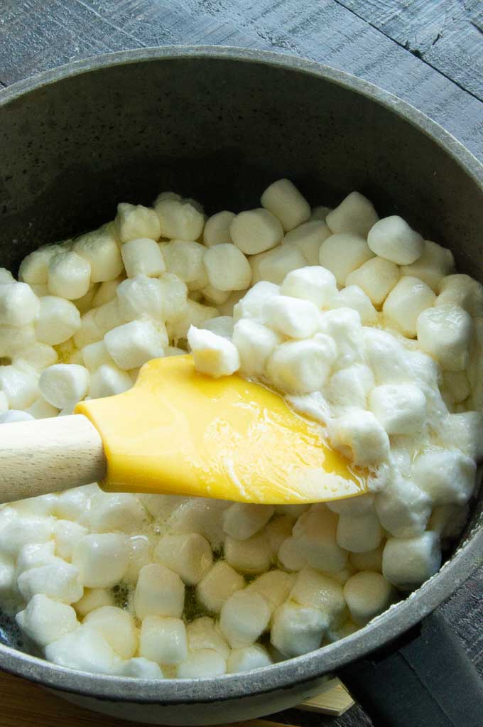 - Add the entire bag of mini marshmallows and stirring constantly until the marshmallows are completely melted.