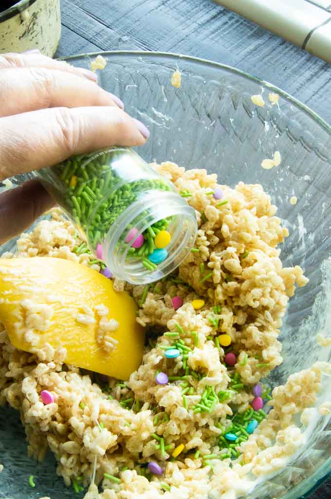 To make life easier I make many of the Easter foods ahead of time! These Rice Krispie treats can be made the day ahead and will still be nice and fresh.