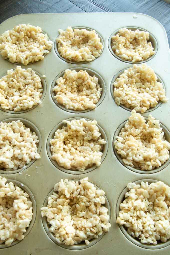 - Rub butter onto your hands, or spray with olive oil spray. (this helps cut down on having it stick to your hands.---note it will still stick a little) Then carefully place marshmallow Krispies into each muffin tin. Use your finger to create a nest in the center. (push the center down)
