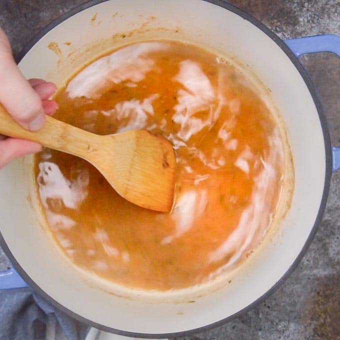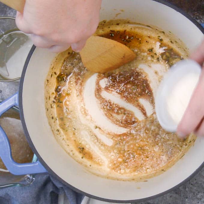 - Add flour and let it cook for a few minutes until the butter and flour are fully integrated.