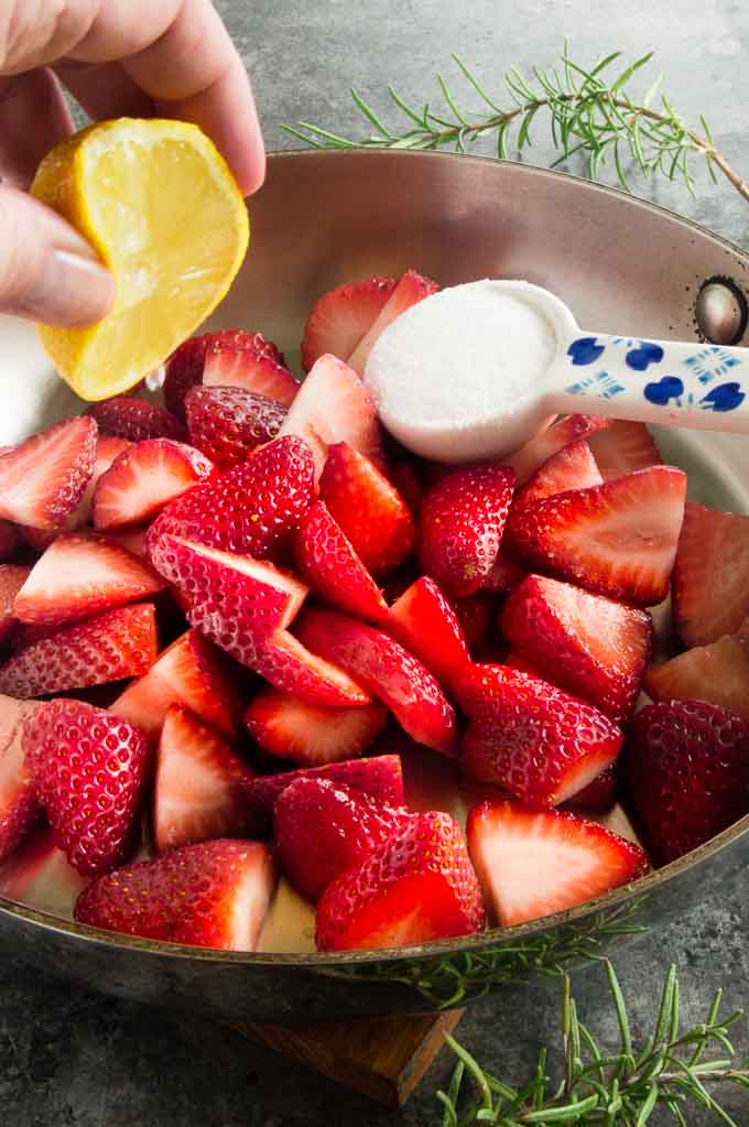 You won’t believe how easy making fresh strawberry compote is! It’s as simple as cutting the strawberries and placing them in a skillet with a small amount of sugar and a squeeze of fresh lemon juice.